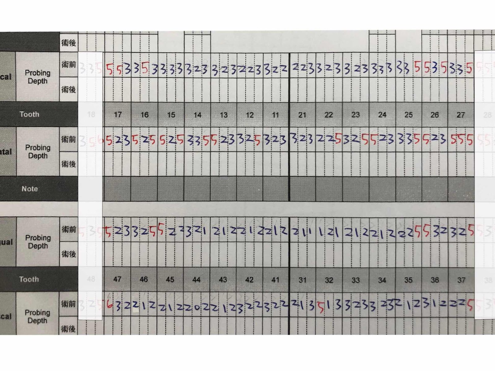 如果是有follow我之前文章就知道,牙周囊袋在5mm(紅字)就有可能是輕微牙周病,只要能跳到5mm以下大致上就脫離牙周病發炎狀態。